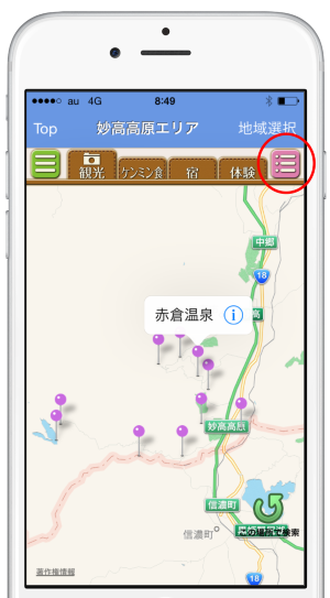 画面右下の地図ボタンをタップすると、地図画面に切り替わります。