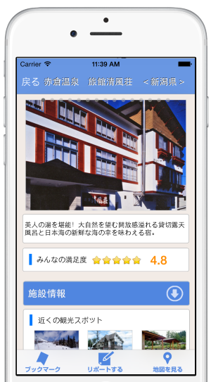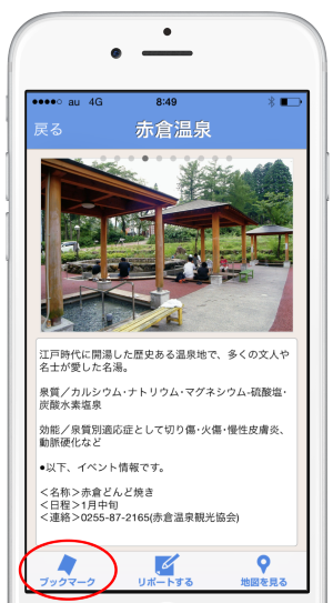 スポット詳細画面です。気になるスポットにはすぐ「ブックマーク」を貼りましょう。
