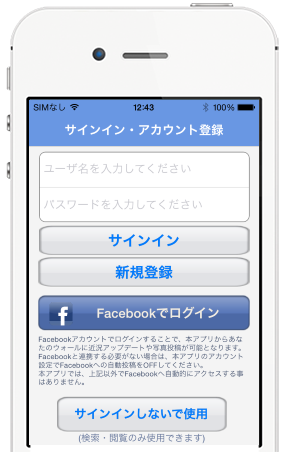 Facebookアカウントをお持ちで無い方も、ユーザ名とパスワードを登録してサインインして頂けます。