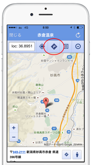 ここで上のナビボタンをタップすると、現在地から目的地までの経路検索ができます。