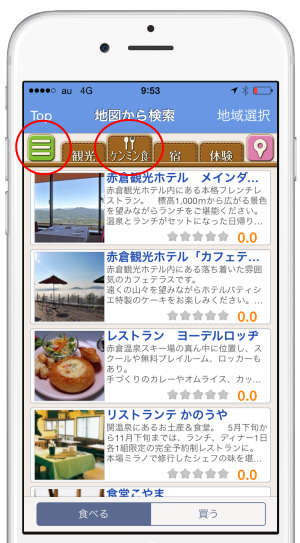 また、上部のタブで観・食・宿・体験を切り替えて検索できます。