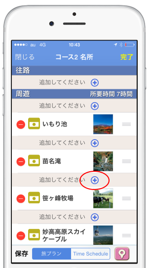 「+」ボタンをタップすると、行きたいスポットをプランに追加できます。