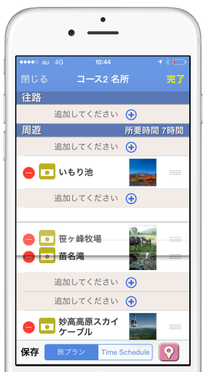 プラン作成画面です。画面右上の「編集」ボタンで行きたい場所を並べて、「完了」「保存」で、マイプランに登録します。